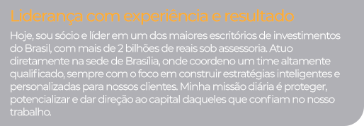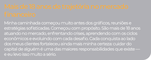 Atuo no mercado financeiro ajudando pessoas a organizarem suas finanças e a fazerem o dinheiro trabalhar a favor delas. Acredito que liberdade financeira não é só sobre ganhar mais — é sobre saber usar bem o que você já tem. Com estratégia, disciplina e visão de longo prazo, é possível transformar realidade. Durante minha jornada, conheci muita gente travada por medo ou falta de informação. Foi aí que decidi ir além: transformar o que aprendi em algo acessível, prático e que realmente funcione na vida real. Se você quer investir com mais segurança, proteger o que construiu ou simplesmente aprender a cuidar melhor do seu dinheiro, pode contar comigo.